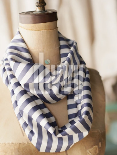 A blue and white infinity scarf is draped around the neck of a sewing mannequin.