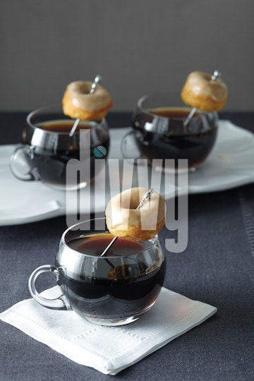 Maple glazed mini donuts are served with skewers on the rims of coffee cups.