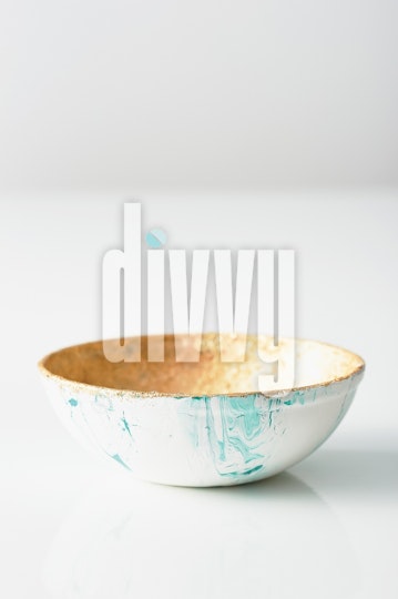 A handmade teal and white marbled bowl has a gold leaf interior.