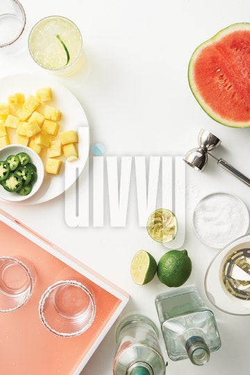 Fruit, salted glasses, tequila bottles, and bar tools are laid out on a table to prepare margaritas.