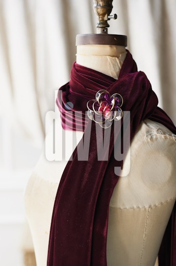 A maroon scarf is secured with a flower brooch and placed around the neck of a sewing mannequin.