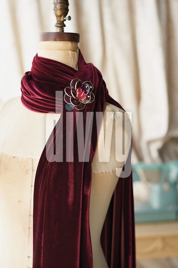 A maroon velvet scarf is secured with a flower brooch and draped around the neck of a sewing mannequin.