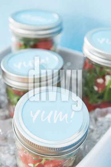 Easy to eat individual jars of various salads keep cool on ice at a party buffet.