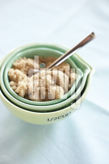 Nesting ceramic measuring cups filled with brown sugar and a spoon.