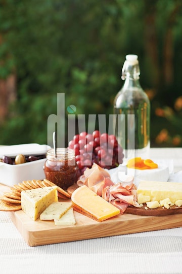 A cutting board filled with assorted cheeses, sliced ham, crackers and jam is arranged on an outdoor table with a water bottle, a container of olives, a bunch of red grapes and a wheel of Brie.