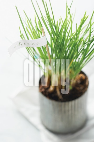 A flag label sticks out of a metal planter with fresh homegrown chives on a white table.
