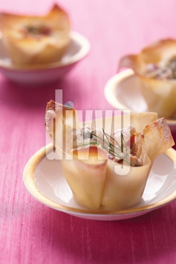 Smoked salmon salad is served in wonton cups on tiny gold-rimmed dishes on a hot pink silk tablecloth.