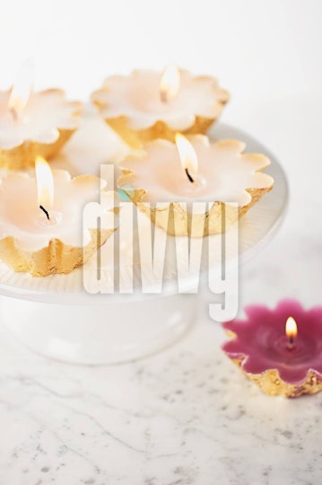 Handmade mini candles with gold leaf around the edges are grouped on a white cake stand.