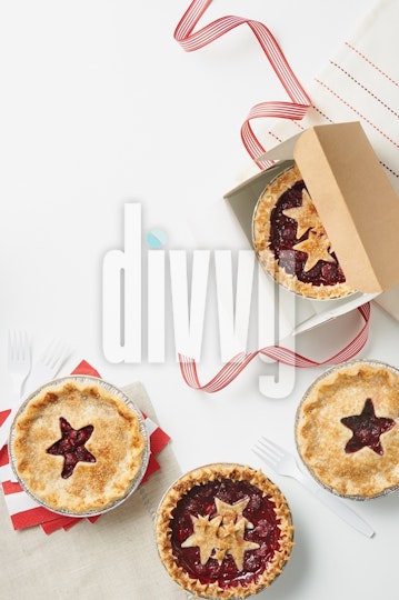 Four mini cherry pies decorated are decorated with star cutouts on a white background and packaged to take on the go or give as a gift.
