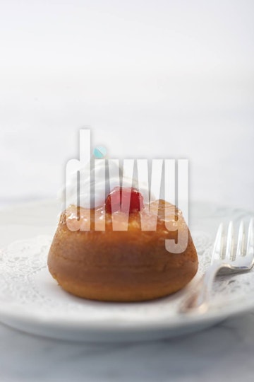 A mini upside down pineapple cupcake, topped with whipped cream, is served on a white plate.