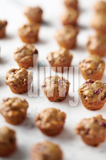 Lines of cherry-walnut mini muffins are neatly arranged in a grid.