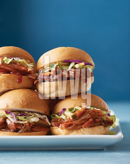 Mini pulled-pork sliders topped with barbecue sauce and coleslaw are stacked on a platter in front of a blue wall.