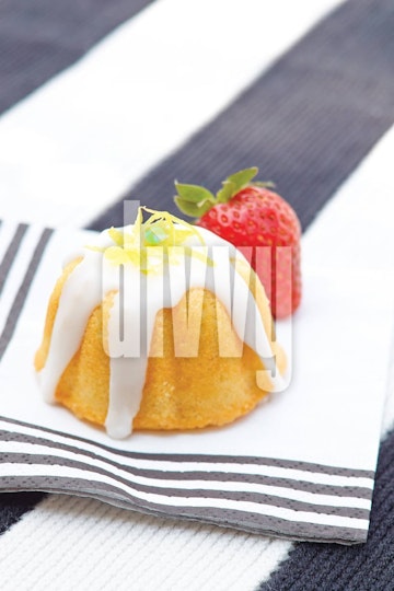 A mini shortcake drizzled with icing and topped with lemon shavings arranged on a napkin next to a strawberry sits on a black and white striped blanket.