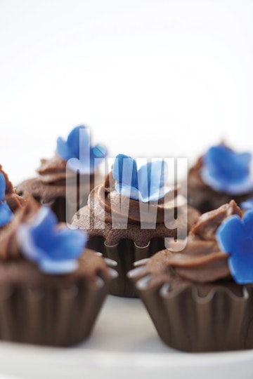 A group of miniature chocolate cupcakes are decorated with blue flowers.