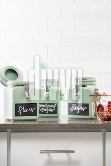 Three mint-colored canisters labeled flour, sugar and powdered sugar are gathered on a kitchen counter next to a wire basket containing copper measuring cups.