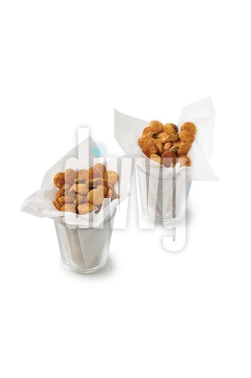 Two glasses are filled with moroccan spiced crackers mixed with pistachio nuts.