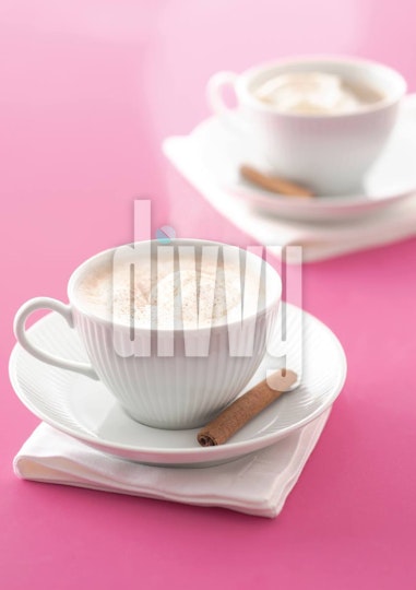 Two mugs of chai tea lattes beside cinnamon sticks on saucers rest on napkins on a pink background.