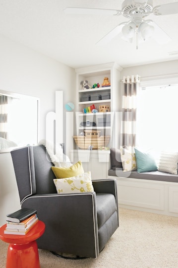A dark grey chair is set up in the middle of an organized modern gray nursery.