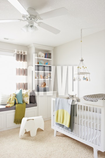 A modern baby nursery is decorated in neutral gray tones with pops of colors and well-organized shelves.
