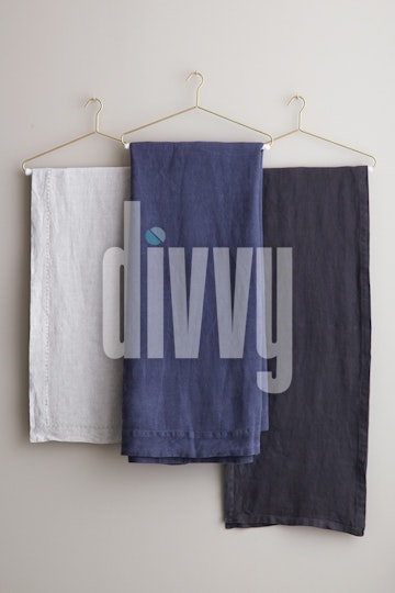 A set of three linen blankets in silver, navy and indigo on gold hangers hanging on the grey wall.
