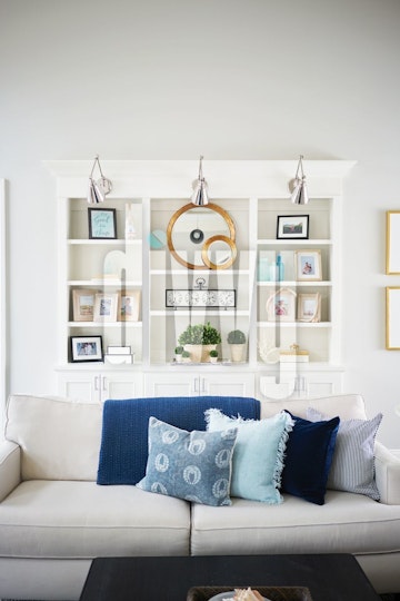 A grey fabric sofa with blue accent pillows and blanket sits in front of a large white china hutch displaying pictures, gold mirrors, plants, blue vases and white coral.