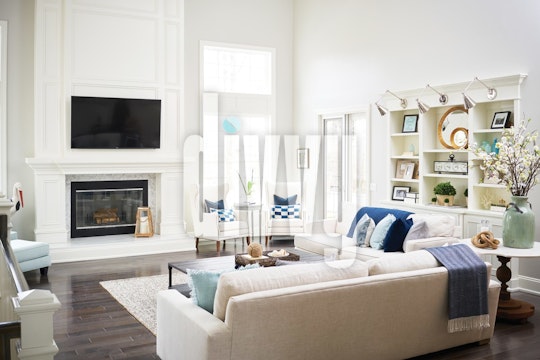 A herringbone tiled wood fireplace with floor to ceiling surround surrounded by white chairs and beige sofas with blue accent pillows and throws, while a white china hutch with home decor sits against the wall.