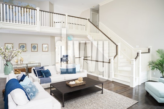 White Living Room with White Spindle Staircase