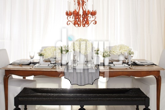 A formal black and white table setting has a pop of color with an orange chandelier.