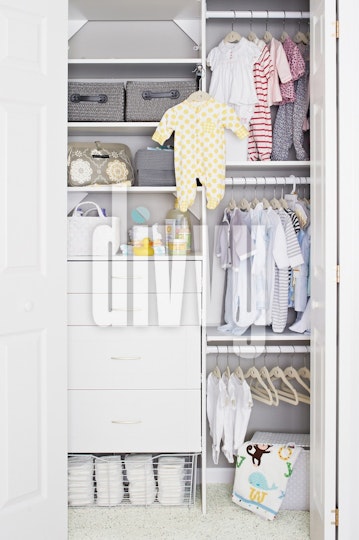 A closet in a baby nursery holds organized clothes and baby necessities.