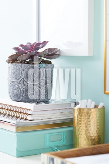 Notebooks are stacked under a potted succulent plant next to a cup of pens on a home office desk.