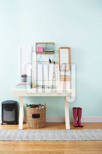 A neatly-organized white office desk holds office supplies under a calendar, shelf and mirror on a light blue wall.