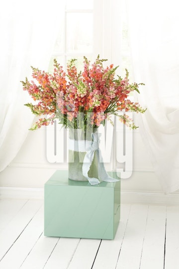 A frosted glass vase with a cloth ribbon holds an arrangement of orange and pink snapdragons.