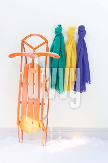 An orange sled leaning against a wall next to three scarves in green, yellow and purple.