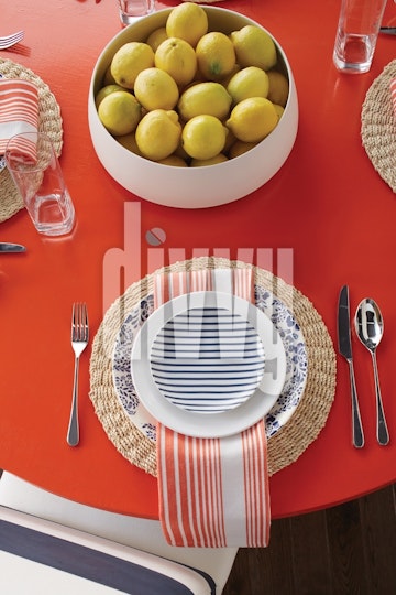 An orange table is set with blue-patterned place settings with basketweave placemats around a centerpiece bowl of lemons.