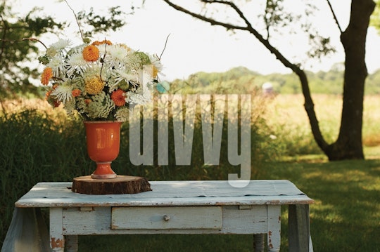 Orange vase filled with an autumnal floral arrangement is displayed on an antique farm table in a field.