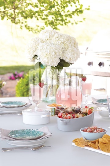 Kabobs and chips and salsa are served on an outdoor patio table with a centerpiece of white hydrangeas.