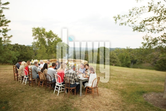 Friends and family eating at a large table set up outdoors for a fall harvest party.
