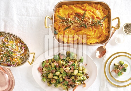 A trio of side dishes—couscous salad, Brussels sprouts with prosciutto and sweet potato mash—are served on a white table cloth with gold-rimmed plates.