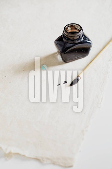 A sumi brush sits next to a glass jar of ink on top of a piece of handmade paper.