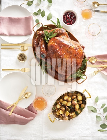 A roasted turkey garnished with bunches of fresh sage is the centerpiece of a table set with pink and gold place settings.