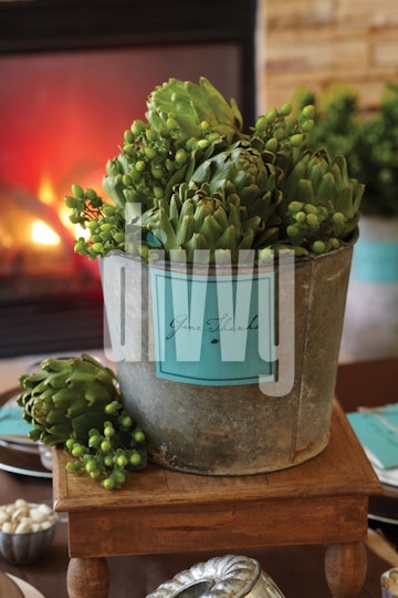 Decorative rustic pail of artichokes sit on a wooden pedestal near a fireplace.