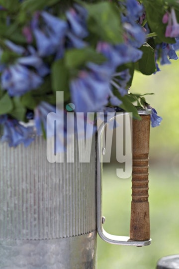 Rustic watering can with wooden handle holding a bouquet of bluebells outside.
