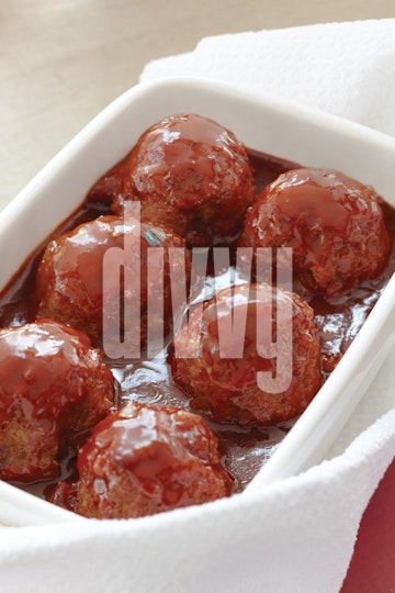 Ham balls are served under a blanket of tomato sauce in a white casserole dish.