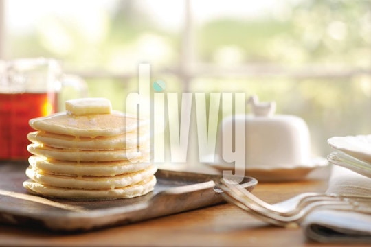 Six pancakes are stacked high, topped with butter and drizzled with syrup, served on a rustic platter.