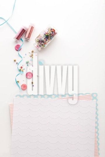 An assortment of craft paper is stacked on a white background with a curl of ribbon, buttons, glitter, beads and sequins.