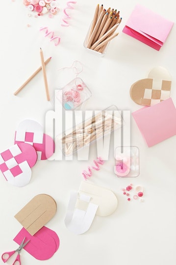 Pink scissors, construction paper, buttons, clothespins, string, colored pencils and pipe cleaners arranged on a white surface.