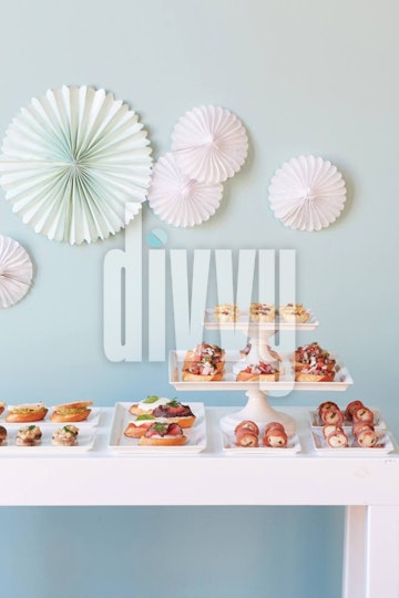 A variety of appetizers are served on a white table in front of an aqua blue wall with paper decorations.