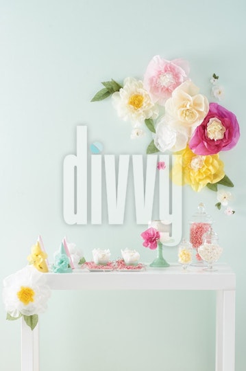 Pastel paper flowers and party decorations site next to glass apothecary jars of candy on a white table.