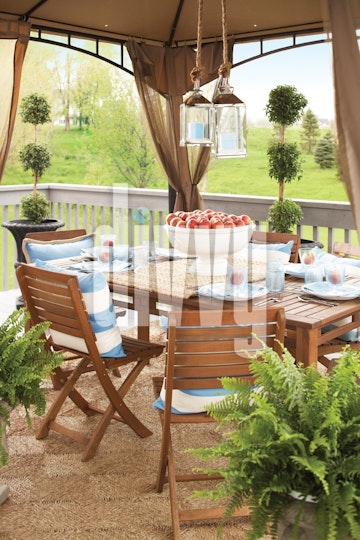 An outdoor table is set under a gazebo tent, with wooden chairs, pillows and a large bowl of peaches as a centerpiece.