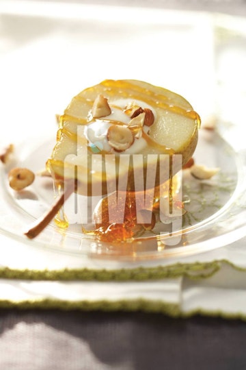 A cooked pear half is topped with yogurt, drizzled with an agave-brown sugar syrup and sprinkled with toasted hazelnuts.